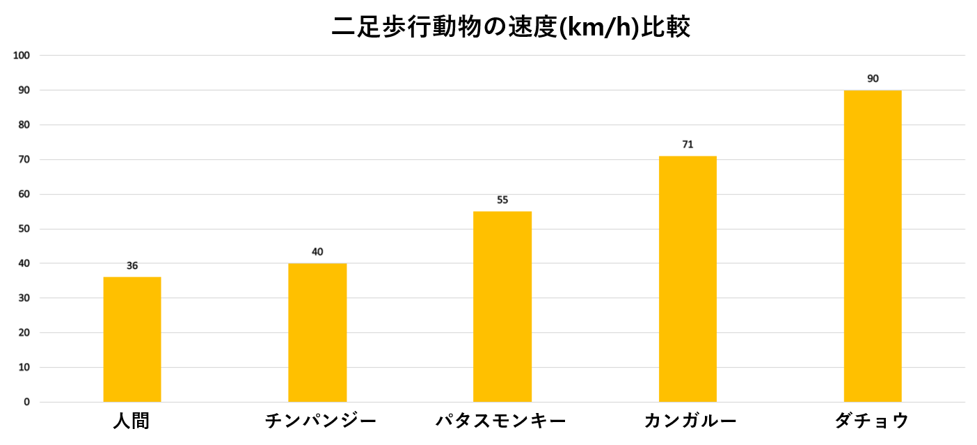 100mを10秒で走ることを人間の平均と仮定すると、人間の平均最大速度は36km/hです。当然、鍛え次第でより速い人間もいくらでもいます。例えば、ウサイン・ボルトの100m世界新記録を時速に換算すると、44.18km/hが出ます。これが人間の最速記録です。事実上、人間は早く走る事より、長く走ることに適している動物です。
