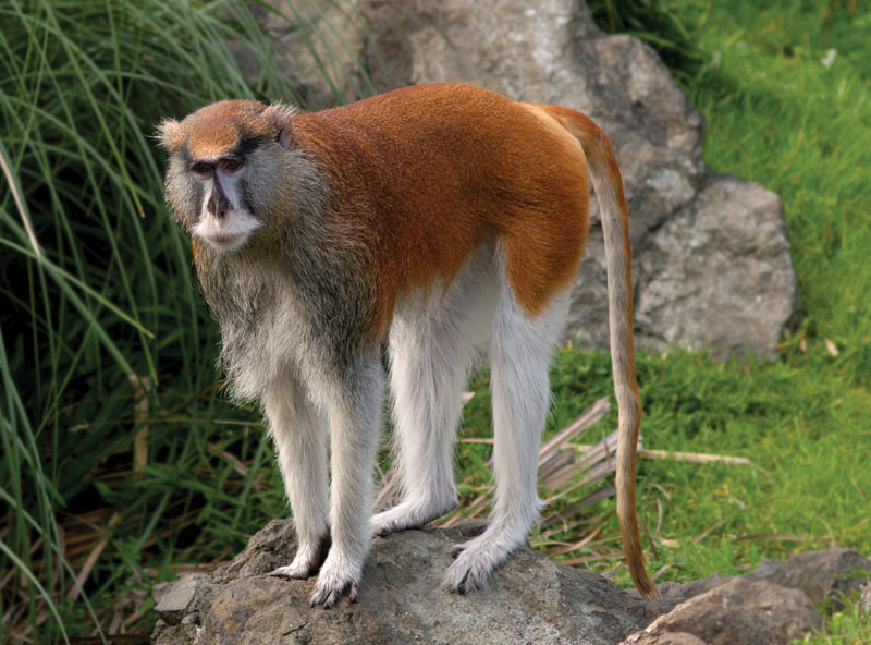 パタスモンキーは、霊長類の中で最も早い動物です。オスの体重は約10kg程度で小さい方ですが、脚は非常に長いため、最大時速は55kmに達します。主に森の中で居住し、脅威を受けると木の上に避難する他の霊長類とは異なり、パタスモンキーはサバンナに群れを組んで生息し、脅威を受ける早いスピードを生かして逃げる傾向があります。